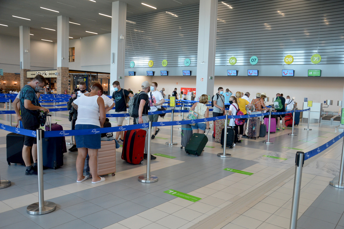 Τουρίστες περιμένουν στην ουρά του ελέγχου εισιτηρίων, ώστε να επιβιβαστούν σε πτήση προς τη Μ. Βρετανία, την Τρίτη 8 Σεπτεμβρίου 2020, στο Αεροδρόμιο Ζακύνθου. Σε συναγερμό έχουν τεθεί δεκάδες χιλιάδες Βρετανοί -60.000, όπως αναφέρει η «Daily Mail»- που κάνουν διακοπές στα ελληνικά νησιά που προστέθηκαν στην «κόκκινη λίστα» της βρετανικής κυβέρνησης, καθώς, αν δεν προλάβουν την προθεσμία επιστροφής στη χώρα τους, θα αναγκαστούν να παραμείνουν σε καραντίνα. Υπενθυμίζεται ότι ο υπουργός Μεταφορών της Βρετανίας, Γκραντ Σαπς, ανακοίνωσε χθες ότι οι Βρετανοί που βρίσκονται σε Λέσβο, Τήνο, Σέριφο, Μύκονο, Κρήτη, Σαντορίνη και Ζάκυνθο πρέπει να επιστρέψουν στη χώρα έως την προσεχή Τετάρτη στις 4 π.μ., ειδάλλως θα υποβάλλονται σε καραντίνα αμέσως μετά την επιστροφή τους στη Βρετανία. ΑΠΕ-ΜΠΕ/ΑΠΕ-ΜΠΕ/Κώστας Συνετός