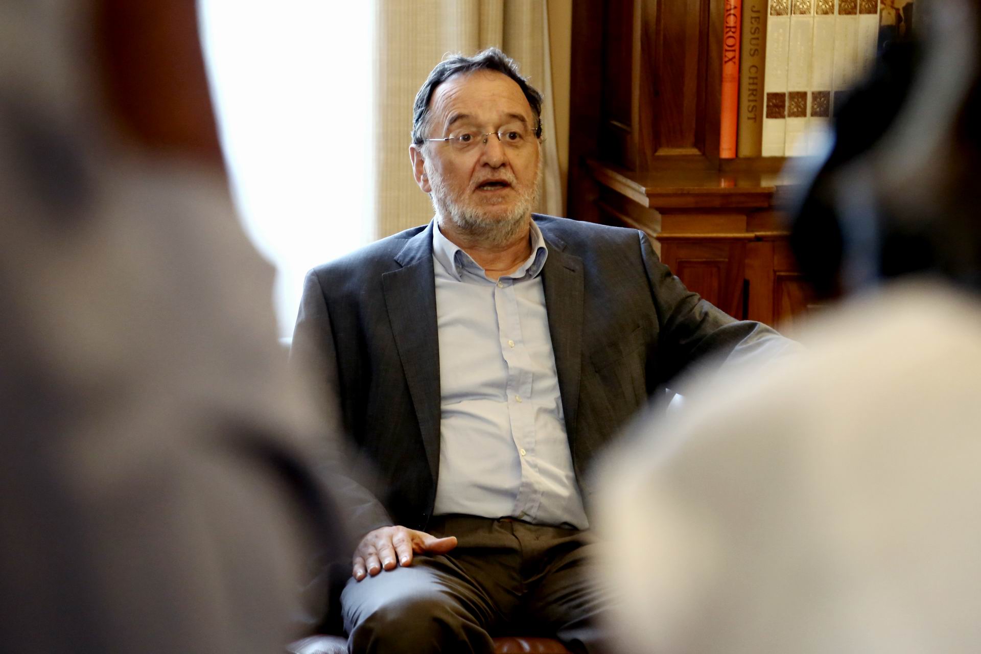 Συνάντηση του προέδρου του νεοσυσταθέντος κόμματος της «Λαϊκής Ενότητας» Παναγιώτη Λαφαζάνη με τον Πρόεδρο της Δημοκρατίας Προκόπη Παυλόπουλο, προκειμένου να παραλάβει την διερευνητική εντολή σχηματισμού κυβέρνησης. Αθήνα, Δευτέρα 24 Αυγούστου 2015.