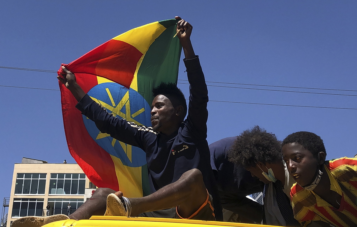 epa08831693 Ethiopians celebrate the military and carry Amhara flags and Ethiopian national flags in the streets after a national call to stand in honour of the Ethiopian National Defence Forces, Addis Ababa, Ethiopia 17 November 2020. (issued 20 November 2020). Aid agencies are calling for an immediate ceasefire in Ethiopia for aid to reach civilians affected by the fighting. The leader of the Tigray region in northern Ethiopia Debretsion Gebremichael has called on the African Union (AU) to intervene to prevent Ethiopia from spiralling into civil war. There is a dispute over control of the region with Ethiopian Prime Minister, Abiy Ahmed, claiming transgressions by Tigray's leaders have pushed him to take military action whilst Debretsion Gebremichael has said Tigray will continue to defend itself until negotiations take place. EPA/STR