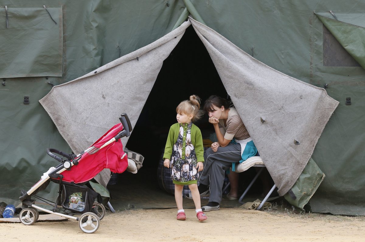 epa04359016 Ukrainian refugees inside a tent at a refugee camp about 10 km from the Izvarino Russia-Ukraine border checkpoint in Rostov region, Russia, 18 August 2014. The Ukrainian National Security and Defence Council said separatist rebels fired on a refugee convoy near the eastern city of Luhansk on 18 August. EPA/YURI KOCHETKOV