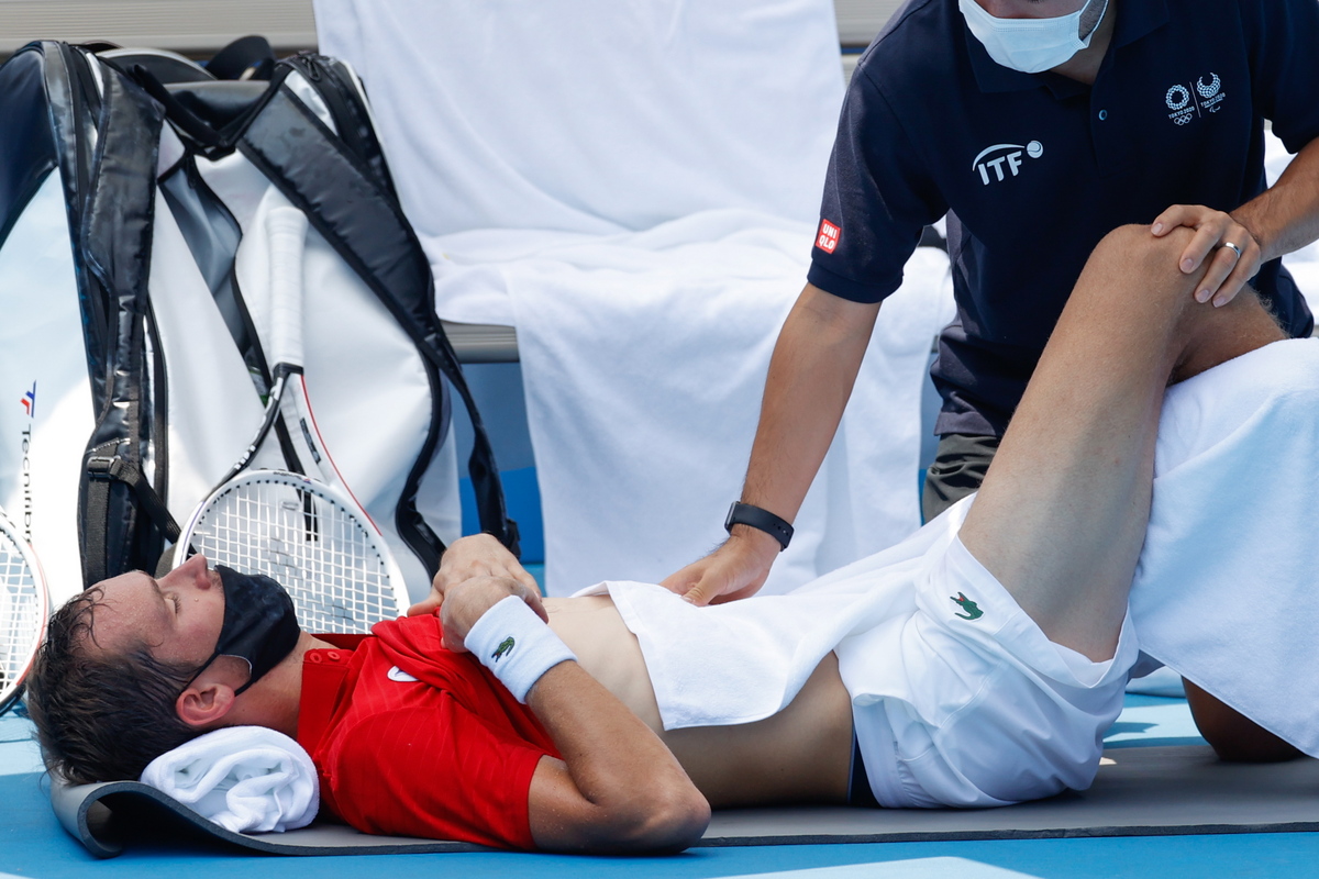 epa09372370 Daniil Medvedev, of the Russian Olympic Committee, has a medical timeout during his men's singles third round tennis match against Fabio Fognini, of Italy, at the Tokyo 2020 Olympic Games, at the Ariake Tennis Park, in Tokyo, Japan, 28 July 2021. EPA/RUNGROJ YONGRIT