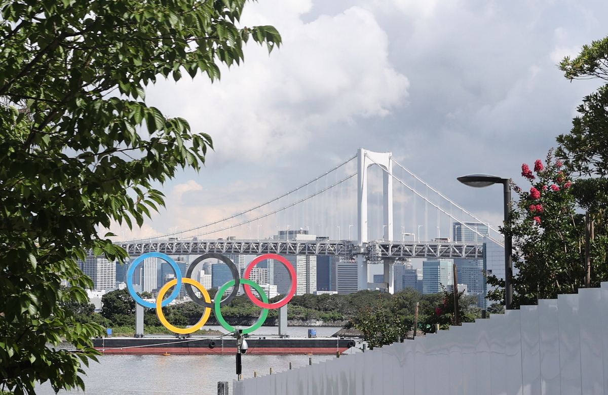 epa09347504 An Olympic rings monument in the Japanese capital's Odaiba waterfront area, with the Rainbow Bridge in the background, in Tokyo, Japan, 16 July 2021. The Tokyo Olympics, which have been postponed for a year due to the coronavirus pandemic, will run from 23 July through 08 August 2021. EPA/YONHAP SOUTH KOREA OUT