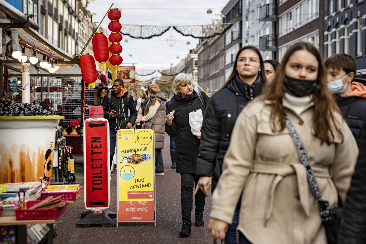 epa09601271 People shopping at the Albert Cuyp Market in Amsterdam, Netherlands, 24 November 2021. The cabinet has introduced anti-covid19 measures to fight against the increasing number of covid-19 cases. EPA/Ramon van Flymen