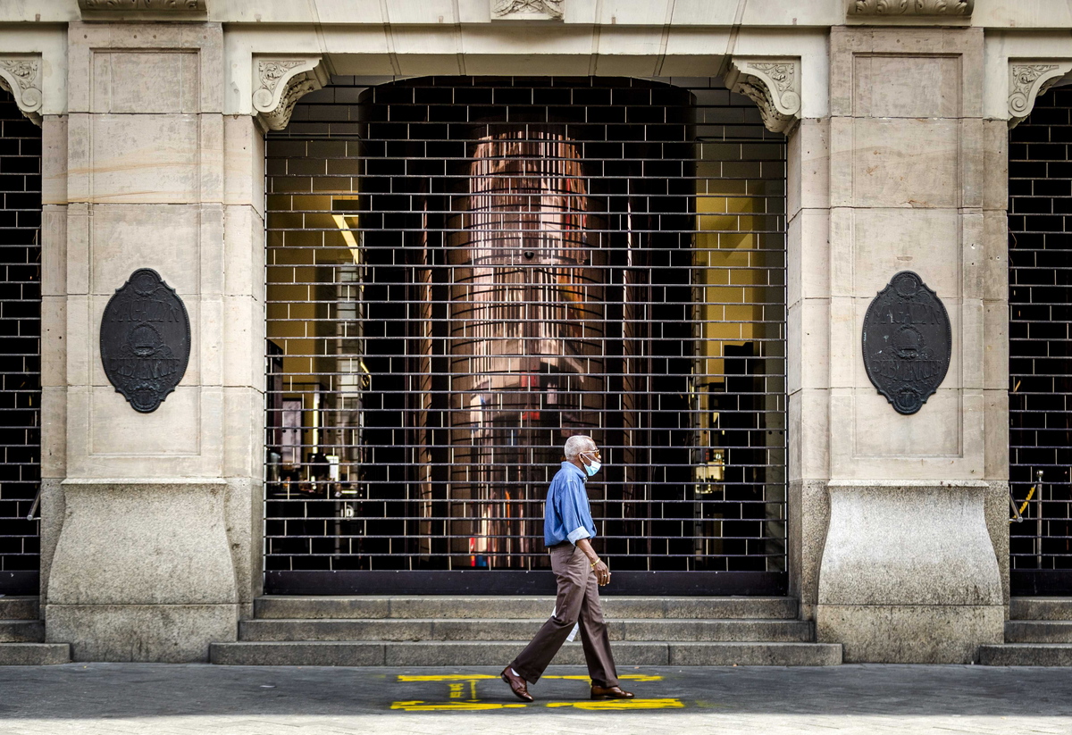 epaselect epa08612905 A man passes by the closed doors at De Bijenkorf in Amsterdam, the Netherlands, 20 August 2020. The department store in Amsterdam has to close its doors because multiple employees are infected with the coronavirus. EPA/Remko de Waal
