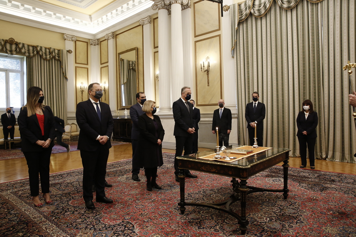 Συγκεκριμένα ενώπιον της Προέδρου της Δημοκρατίας, Κατερίνας Σακελλαροπούλου και του πρωθυπουργού, Κυριάκου Μητσοτάκη, ορκίστηκαν με θρησκευτικό όρκο οι: