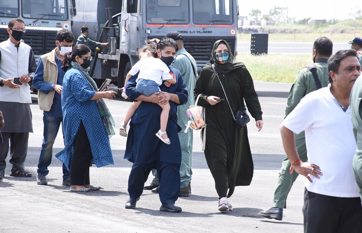 epa09418681 A handout photo made available by the District Information Office Jamnagar, Gujarat, on 18 August 2021 shows people airlifted from Kabul, Afghanistan, after Taliban took over the government, arriving at Jamnagar airbase, Gujarat, India, 17 August 2021. Indian Air force aircraft C-17 Globemaster landed with over 120 Indian diplomats and officials from Kabul. EPA/DISTRICT INFORMATION OFFICE JAMNAGAR HANDOUT HANDOUT EDITORIAL USE ONLY/NO SALES
