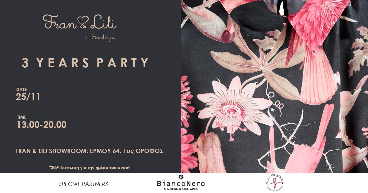 Η online boutique Fran & Lili γίνεται 3 ετών και γιορτάζει με ένα πάρτι που θα μείνει αξέχαστο. Στον ημιώροφο της οδού Ερμού 64, το Σάββατο 25 Νοεμβρίου η μόδα συναντά τη μουσική και το στυλ κατακλύζει το χώρο σε μία ολοήμερη γιορτή που δεν μπορεί να λείψει κανείς!
