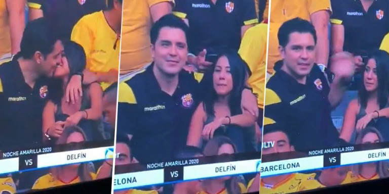 Το βίντεο απεικονίζει αρχικά τον άντρα να έχει αγκαλιάσει και να φιλάει τρυφερά μια νεαρή στις εξέδρες του γηπέδου, στην αναμέτρηση ανάμεσα σε Μπαρτσελόνα και Ντελφίν. Μόλις όμως ο άντρας αντιλαμβάνεται ότι τον δείχνει η κάμερα του γηπέδου, τραβάει το χέρι του από την «παράνομη» και φαίνεται να τα έχει χαμένα, προσπαθώντας να… σώσει ό,τι σώζεται. Την ίδια ώρα, η νεαρή συνοδός του είναι εμφανώς αμήχανη, προφανώς έχοντας καταλάβει τι συμβαίνει…