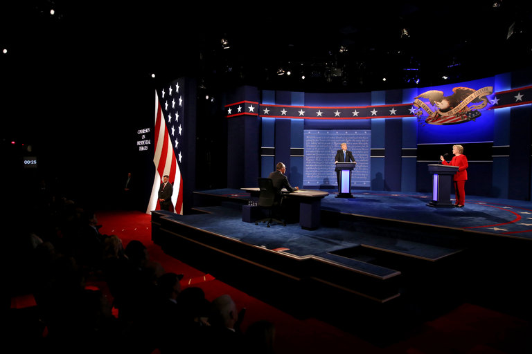 Ο συντονιστής Λέστερ Χολτ δυσκολεύτηκε πολύ να ελέγξει τη ροή της συζήτησης, με τους υποψήφιους να αλλάζουν συνεχώς και απροειδοποίητα θέμα, για παράδειγμα από την εμπορική πολιτική στο Ισλαμικό Κράτος, με τον Τραμπ να κατηγορεί την Κλίντον ότι αποκαλύπτει στον εχθρό πώς σχεδιάζει να τον αντιμετωπίσει. Η υποψήφια των Δημοκρατικών απάντησε ότι αντίθετα με τον Τραμπ, η ίδια έχει τουλάχιστον ένα σχέδιο.