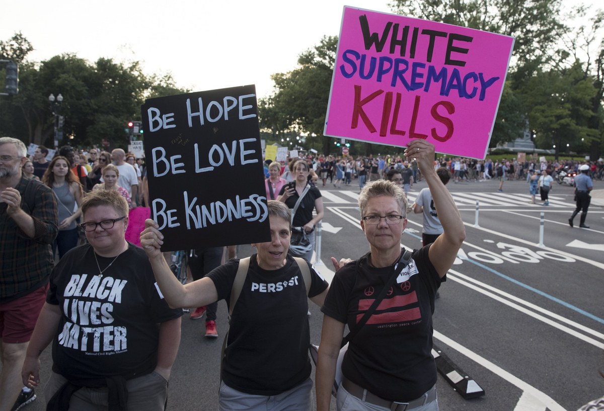 epa06143518 People march down Pennsylvania Avenue during a rally to demonstrate against the violence that took place at a white nationalist rally in Charlottesville, Virginia; in Washington, DC, USA, 13 August 2017. Rallies have been planned across the United States to demonstrate opposition to the violence in Charlottesville. According to media reports at least one person was killed and 19 injured after a car hit a crowd of people counter-protesting the 'Unite the Right' rally which was scheduled to take place in Charlottesville on 12 August. At least 15 others were injured in clashes during protests. EPA/MICHAEL REYNOLDS