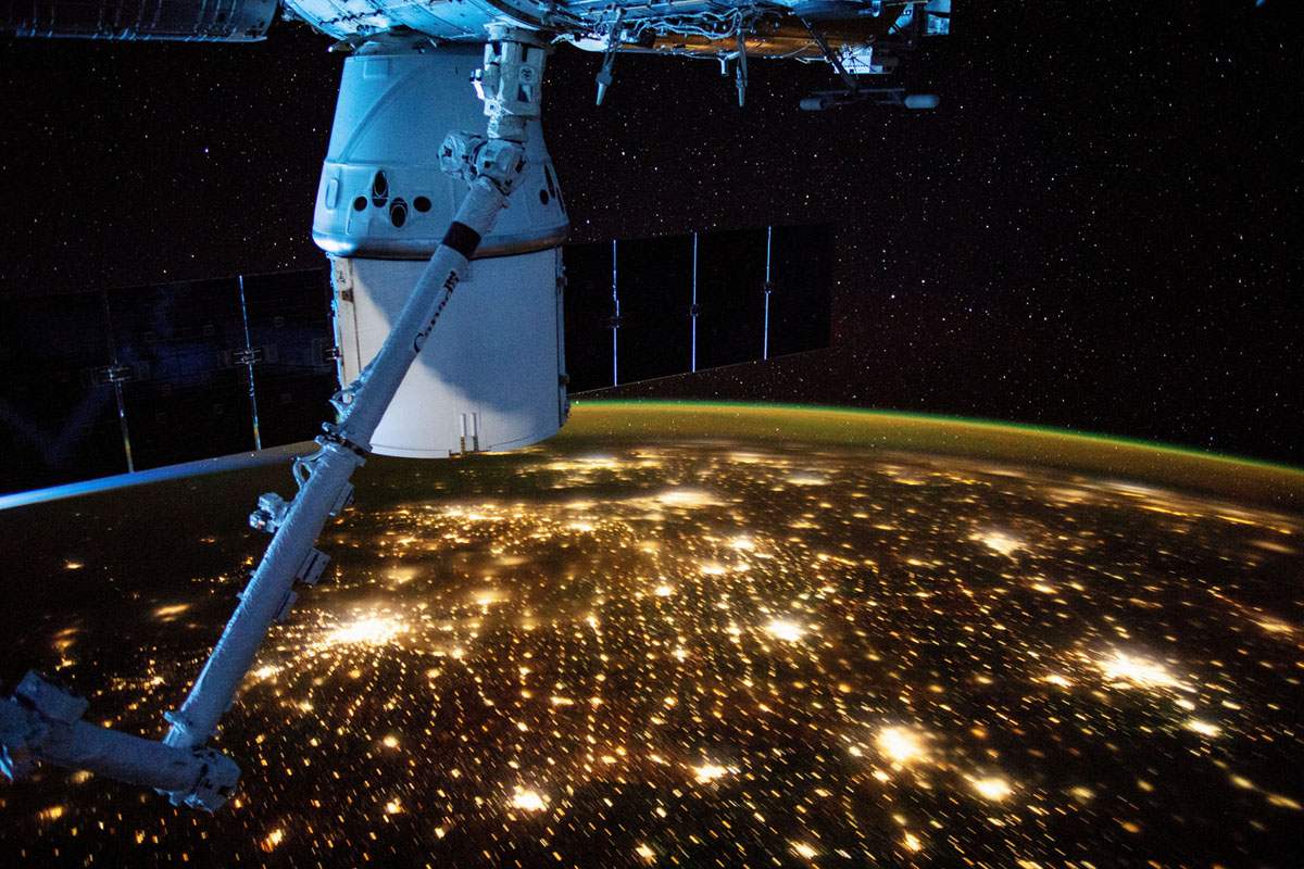 Το διαστημικό σκάφος SpaceX Crew Dragon σκιαγραφείται στον ορίζοντα της Γης κατά τη διάρκεια της Demo-1, της πρώτης πτήσης του προγράμματος Commercial Crew της NASA στον Διεθνή Διαστημικό Σταθμό 4 Μαρτίου