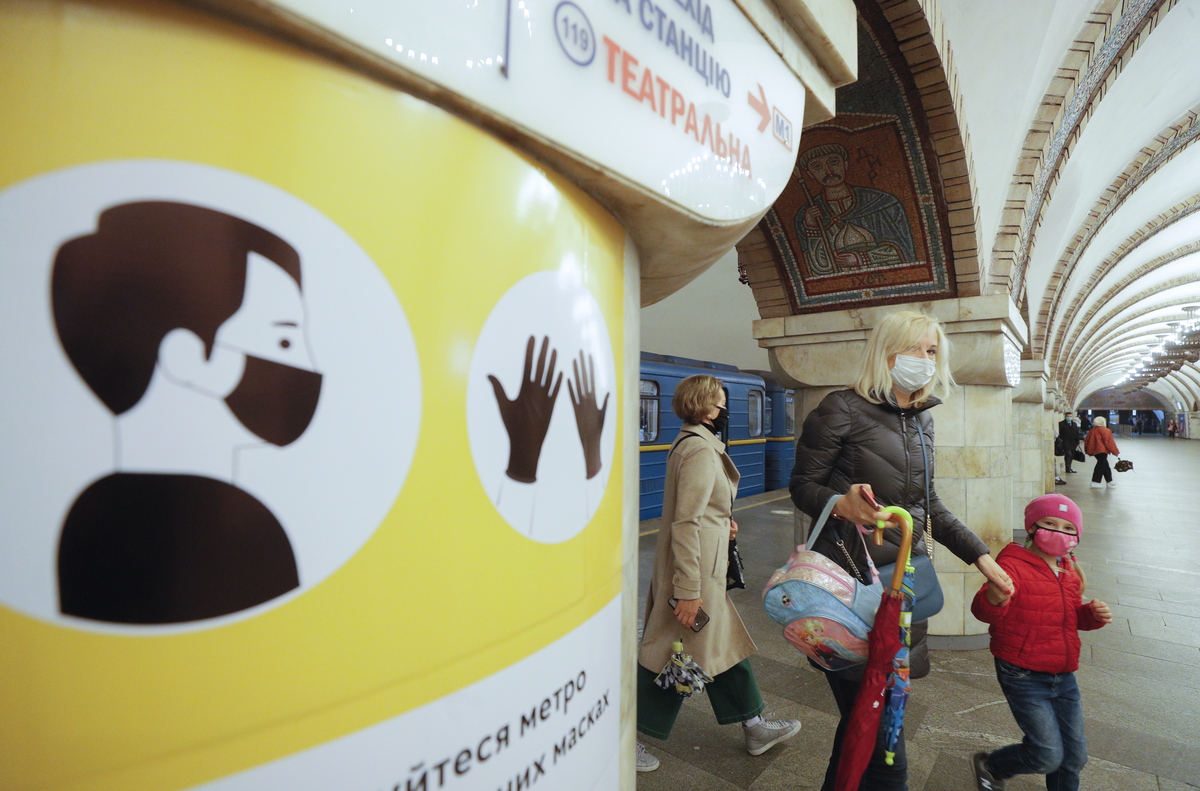 epa08443323 Ukrainians walk next to a placard which reminds about protective measures at a metro station in Kiev, Ukraine, 25 May 2020. The Ukrainian government allowed the resumption of the subway from 25 May, after a two-month blockage caused by the spread of the coronavirus pandemic. Face masks or respirators remain mandatory, so passengers will not be allowed to enter unless they wear them. Ukrainian Cabinet of Ministers moved to introduce so-called adaptive quarantine across the country from 22 May to 22 June, in which the applicable strictness of the quarantine measures will be delegated to regional authorities. EPA/SERGEY DOLZHENKO