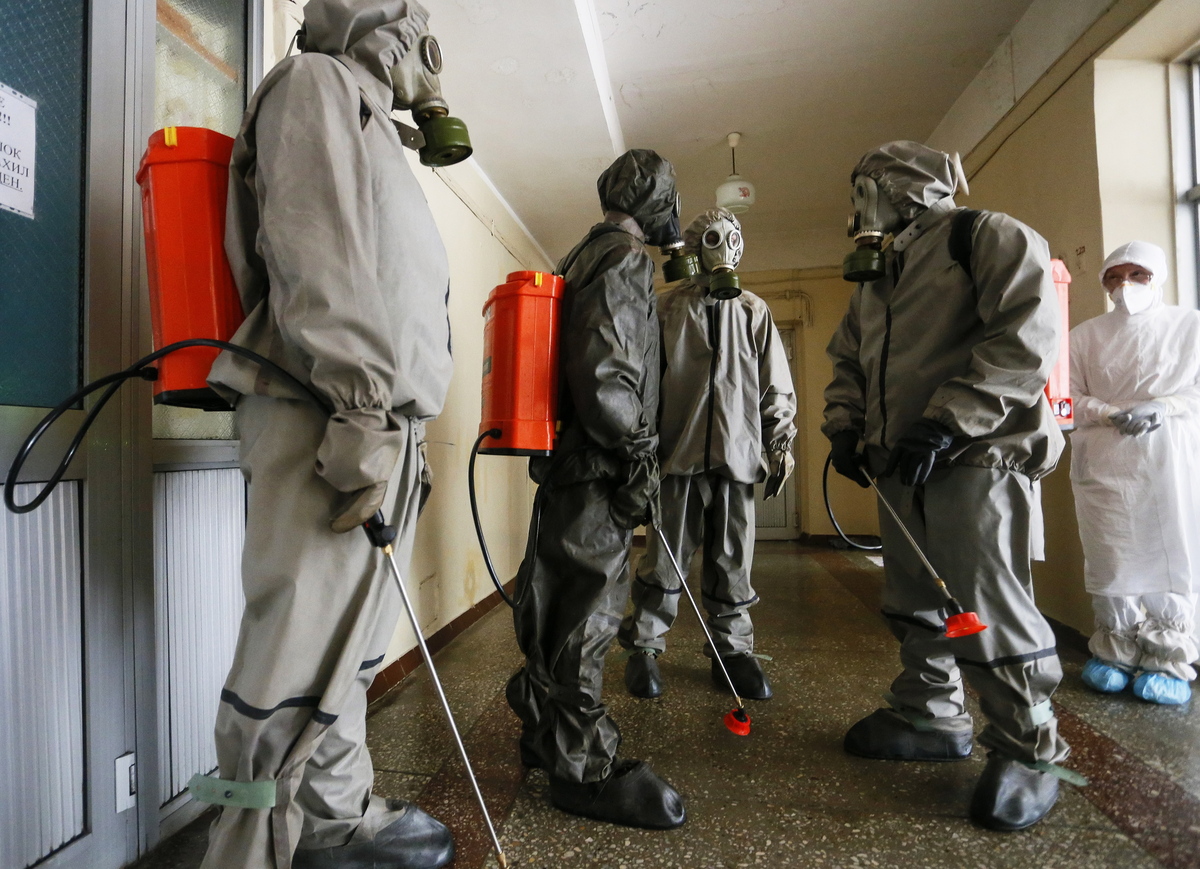 epa08415680 Workers of the Emergency Service of the Ministry of self-proclaimed Donetsk People's Republic (DPR) prepare to spray disinfectant inside a hospital, where COVID-19 patients receive treatment, in the pro-Russia militants controlled city of Donetsk, Ukraine, 11 May 2020, amid the ongoing coronavirus COVID-19 pandemic. Data on infections with the COVID-19 disease caused by the SARS-CoV-2 coronavirus from Russia-controlled areas, the Autonomous Republic of Crimea, the city of Sevastopol, parts of Donetsk and Luhansk regions, is not available. EPA/DAVE MUSTAINE