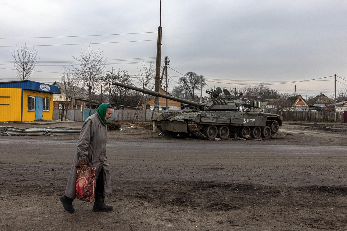 epaselect epa09861036 An elderly woman walks past a damaged Russian tank in recaptured by the Ukrainian army Trostyanets town, in Sumy region, Ukraine, 30 March 2022. Trostyanets was recaptured by the Ukrainian army after the town was under the control of Russian forces for over a month following the invasion on 24 February. The local residents claim that Russian soldiers were not letting bury the dead people, forcing many to leave their homes to move into those houses, and were looting in the town. Locals were saying that some of the town's residents were killed by Russian soldiers. When the Russian army was withdrawing from Trostyanets they stole many cars from local people, as well as different electronic devices. EPA/ROMAN PILIPEY