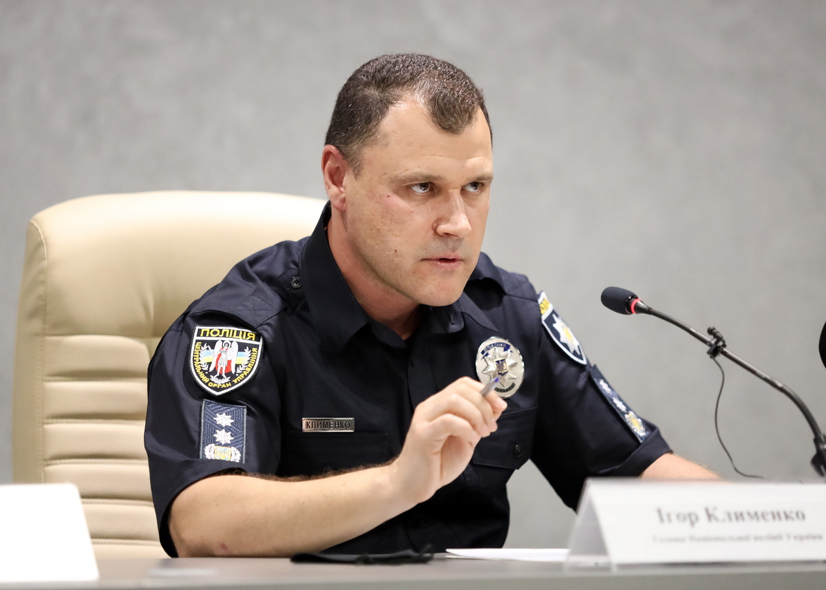 epa09391369 Head of the National Police of Ukraine, Ihor Klymenko speaks during a press briefing about the death of Belarusian activist Vitaly Shishov, in Kiev, Ukraine, 03 August 2021. The body of missing Belarusian citizen Vitaly Shishov was found hanged in one of Kiev's parks on 03 August 2021, police said. EPA/STEPAN FRANKO