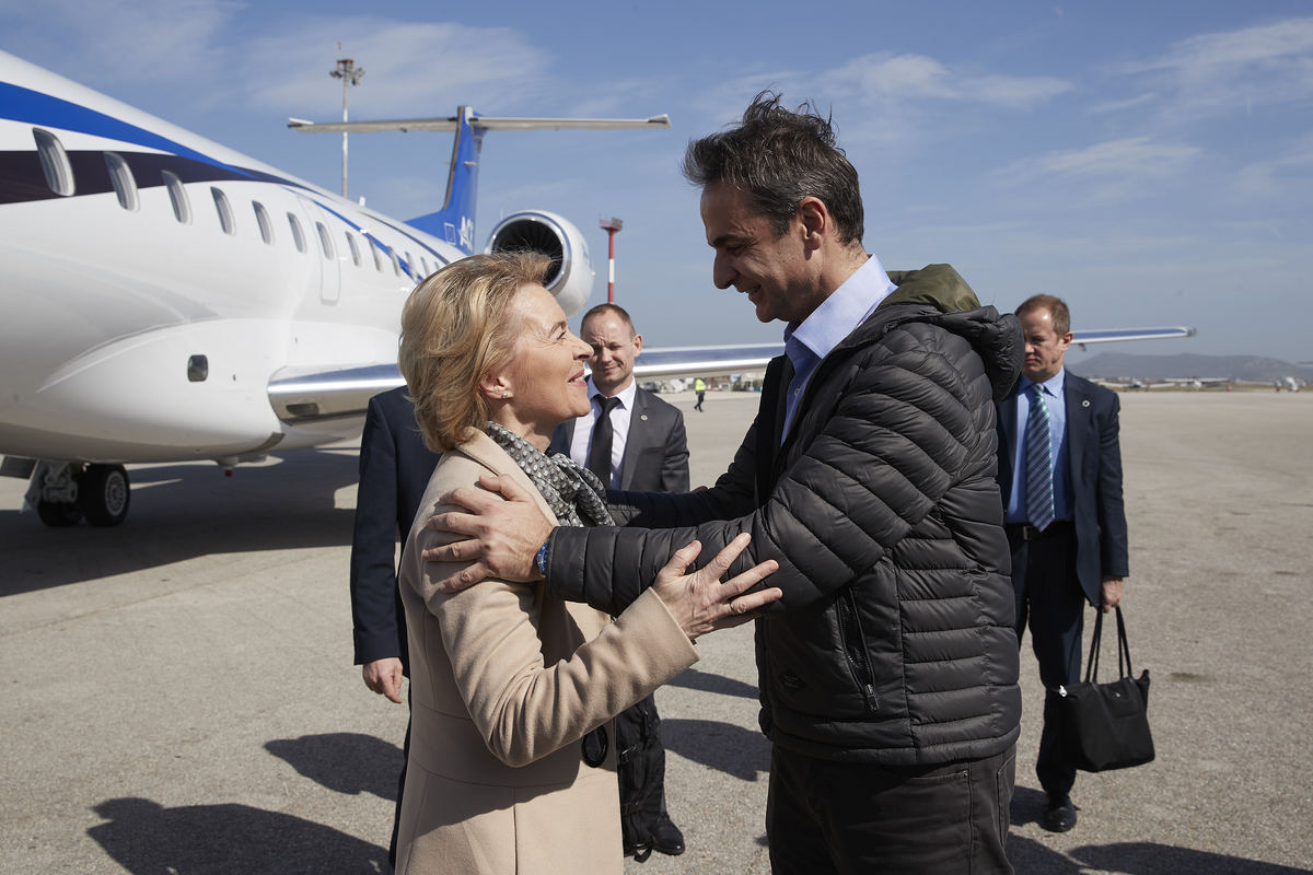 (Ξένη Δημοσίευση) Ο πρωθυπουργός Κυριάκος Μητσοτάκης(Δ) υποδέχεται την πρόεδρο της Ευρωπαϊκής Επιτροπής Ούρσουλα φον ντερ Λάιεν(Ursula von der Leyen) (Α), στο αεροδρόμιο της Αλεξανδρούπολης, Τρίτη 3 Μαρτίου 2020. ΑΠΕ-ΜΠΕ/ΓΡΑΦΕΙΟ ΤΥΠΟΥ ΠΡΩΘΥΠΟΥΡΓΟΥ/ΔΗΜΗΤΡΗΣ ΠΑΠΑΜΗΤΣΟΣ