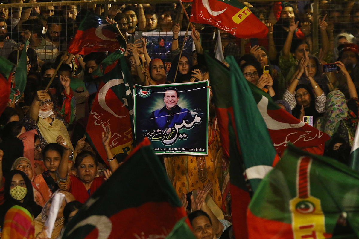 epa09883851 Supporters of Pakistan Tehreek-e-Insaf (PTI) political party during a rally after former Prime Minister Imran Khan, lost the vote of no-confidence in the parliament, in Karachi, Pakistan, 10 April 2022. The opposition's no-trust motion against ex-Prime Minister Imran Khan, on 10 April 2022 passed, with 174 members of the 342-member house voting in favor of the move. Khan, whose five-year term was due to end next year, has claimed that the no-confidence motion was part of a US-backed conspiracy after his Russian visit on the day of the Ukraine invasion. Washington has denied the allegations. EPA/SHAHZAIB AKBER