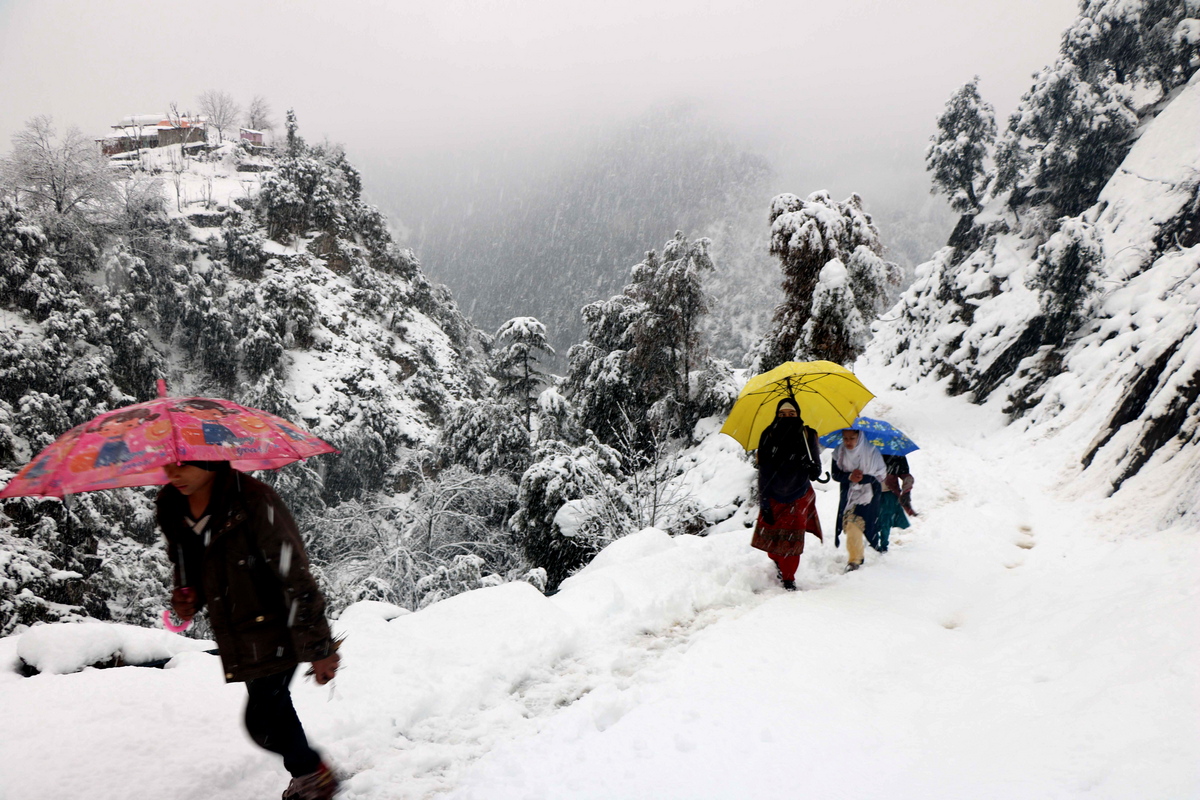 epa08124923 People walk during snowfall in Neelum Valeey, in Pakistani administered Kashmir, 13 January 2020. Reports state that many cities in Pakistan are experiencing unusual cold weather conditions during which regular daytime temperatures fall below zero degree Celsius in wide parts of the country. EPA/AMIRUDDIN MUGHAL