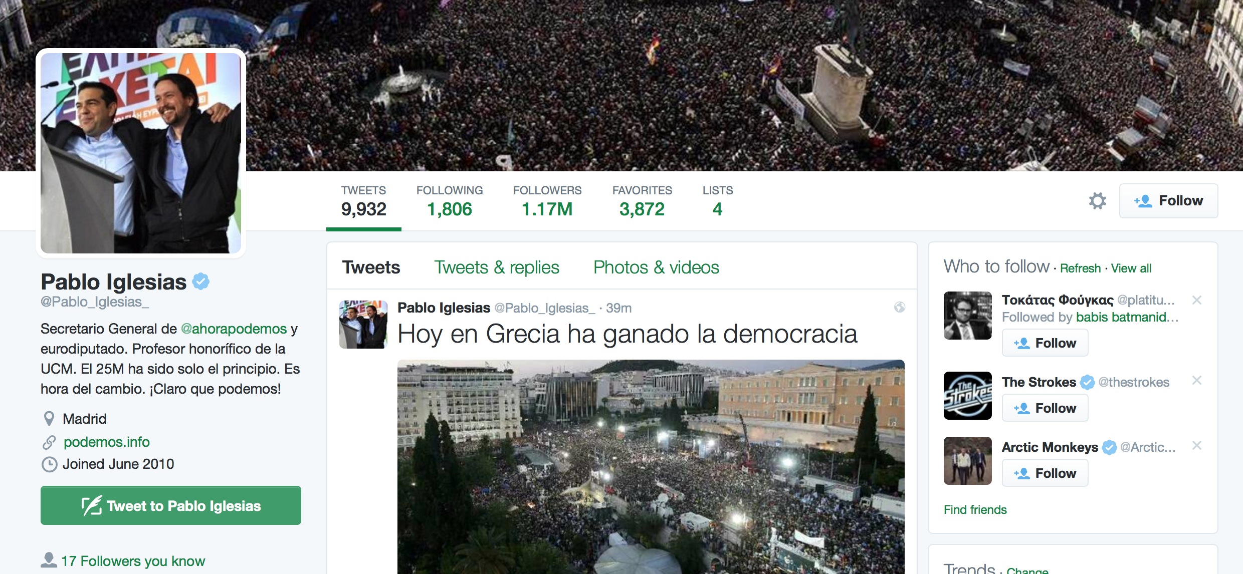 Ο επικεφαλής του ισπανικού κινήματος Podemos, Πάμπλο Ιγκλέσιας ανέβασε πριν λίγο στον προσωπικό του λογαριασμό στο twitter μια φωτογραφία από τη συγκέντρωση της Παρασκευής (στην πλατεία Συντάγματος) υπέρ του ΟΧΙ με την φράση “Η δημοκρατία νίκησε στην Ελλάδα”. Ταυτόχρονα άλλαξε και την profile pic του ανεβάζοντας μια εικόνα που απεικονίζει τον ίδιο αγκαλιά με τον Αλέξη Τσίπρα.