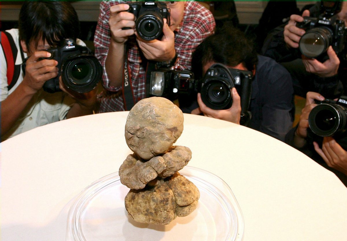 epa00862490 Journalists surround a 1.5 kilo Alba white truffle during a press preview in Hong Kong Tuesday 14 November 2006. The Alba white truffle was won by a Hong Kong bidder for an unprecedented 125,000 euros at an international auction. EPA/YM
