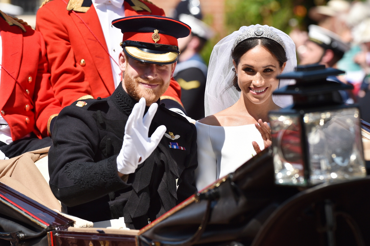 epa06749599 Britain's Prince Harry (L), Duke of Sussex and his wife Meghan (R), Duchess of Sussex ride in a horse-drawn Ascot Landau carriage from St George's Chapel towards Windsor Castle during a procession after their royal wedding ceremony in St George's Chapel at Windsor Castle, in Windsor, Britain, 19 May 2018. EPA/HAHN LIONEL / POOL