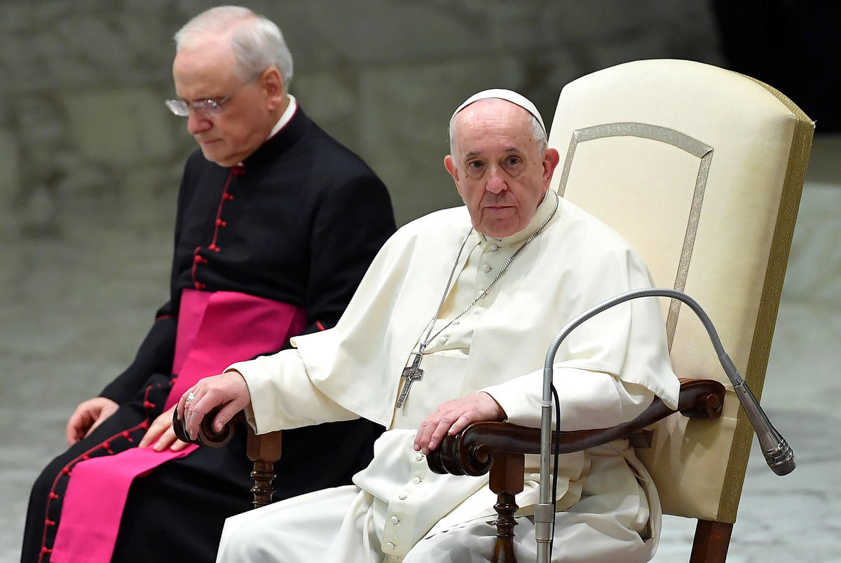 epa09508423 Pope Francis (R) leads the weekly general audience in Paolo VI Hall , Vatican City, 06 October 2021. EPA/ETTORE FERRARI