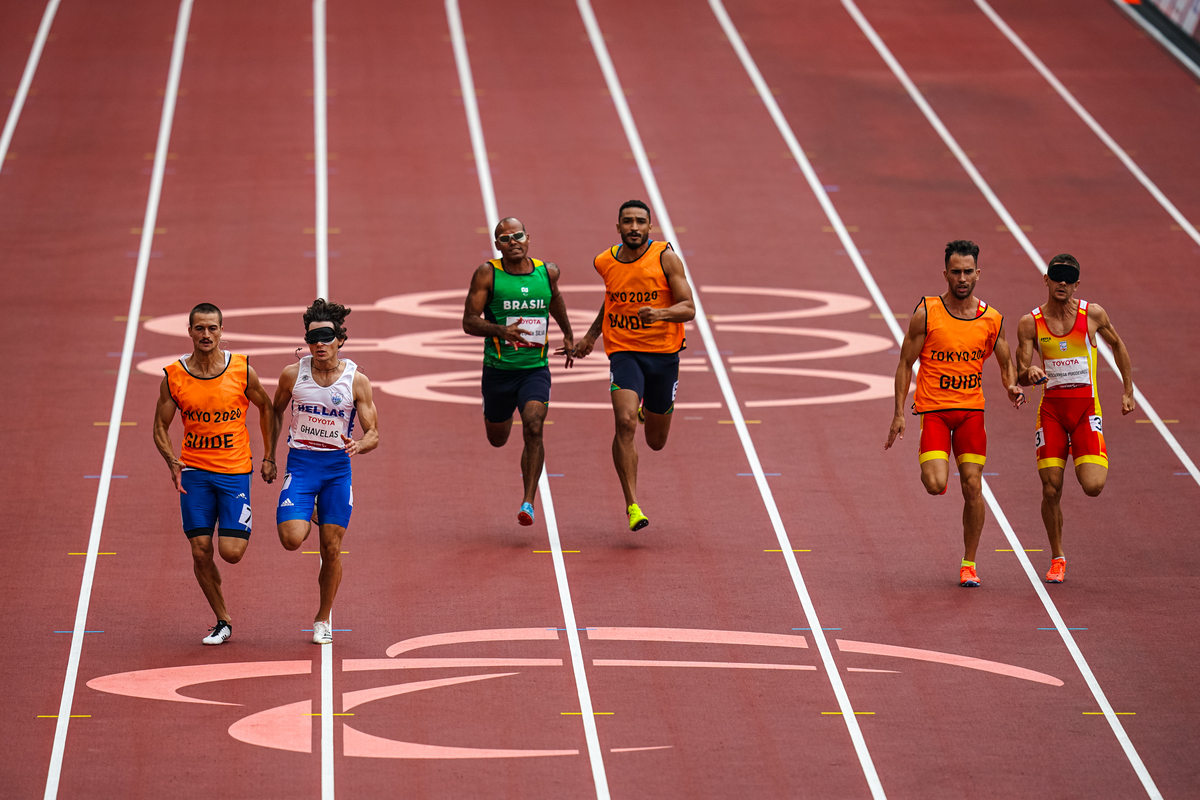 Ο αθλητής Αθανάσιος Γκαβέλας (Α2) αγωνίζεται με guide τον Σωτήρη Γκαραγκάνη (Α), στα 100μ. κατηγορίας Τ11, κατά τη διάρκεια των Παραολυμπιακών Αγώνων στο Τόκιο 2020, Τετάρτη 1 Σεπτεμβρίου Αυγούστου 2021. ΑΠΕ ΜΠΕ/ΕΛΛΗΝΙΚΗ ΠΑΡΑΟΛΥΜΠΙΑΚΗ ΕΠΙΤΡΟΠΗ/ΝΙΚΟΣ ΚΑΡΑΝΙΚΟΛΑΣ