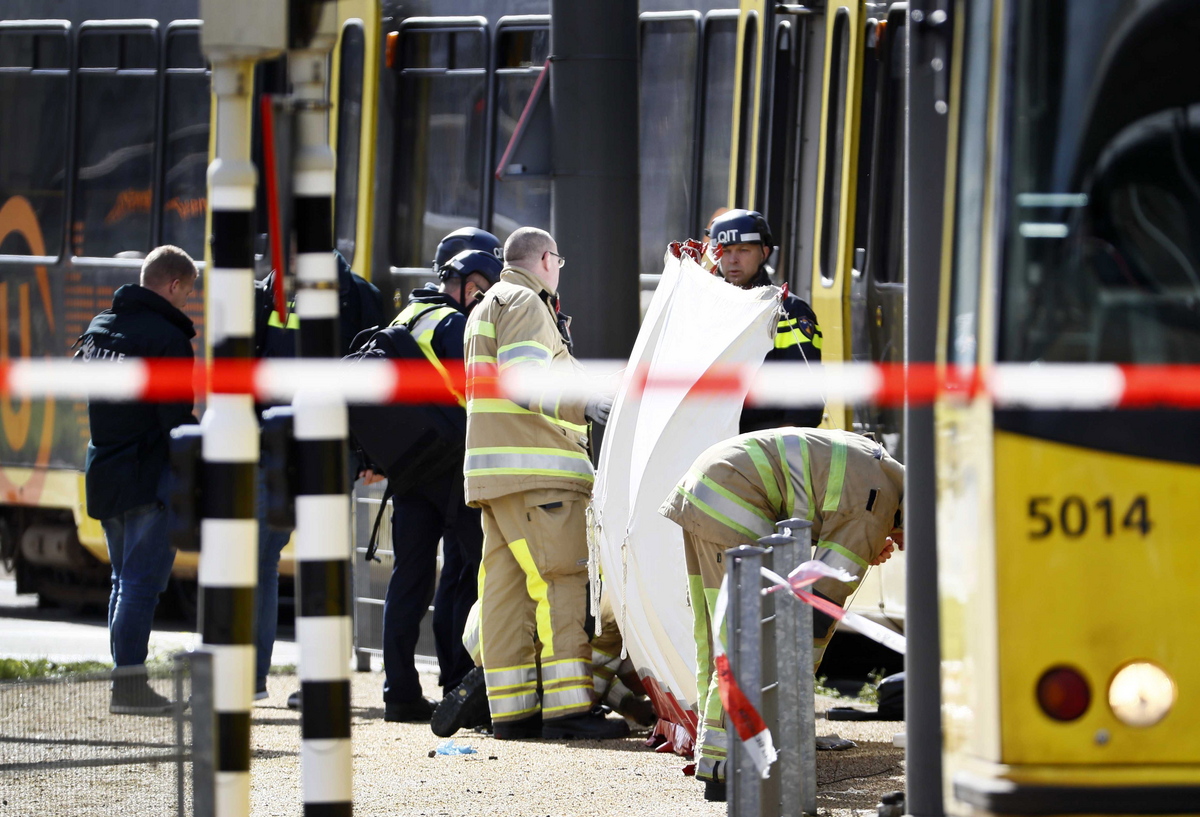 epaselect epa07446537 Emergency services and police forces at the scene where a shooting took place at the 24 Oktoberplace in Utrecht, The Netherlands, 18 March 2019. According to the the Dutch Police, several people have been injured in a shooting on a tram in the central Dutch city of Utrecht. EPA/ROBIN VAN LONKHUIJSEN