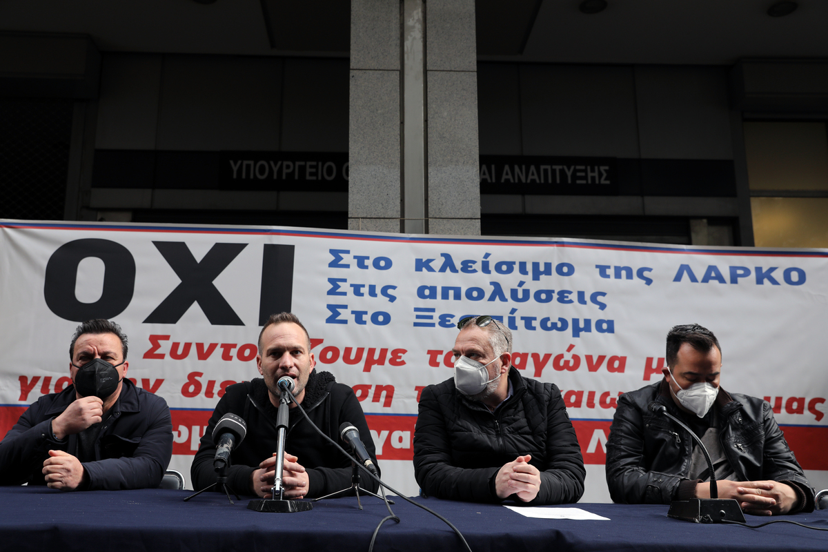 Μέλη των Σωματείων Εργαζομένων της ΛΑΡΚΟ δίνουν συνέντευξη Τύπου έξω από το υπουργείο Οικονομικών, Πέμπτη 10 Φεβρουαρίου 2022. Οι εργαζόμενοι έχουν αποκλείσει το υπουργείο στο πλαίσιο του αγώνα τους ενάντια στην ιδιωτικοποίηση της επιχείρησης και στις απολύσεις εργαζομένων. ΑΠΕ-ΜΠΕ/ΑΠΕ-ΜΠΕ/ΓΙΩΡΓΟΣ ΒΙΤΣΑΡΑΣ