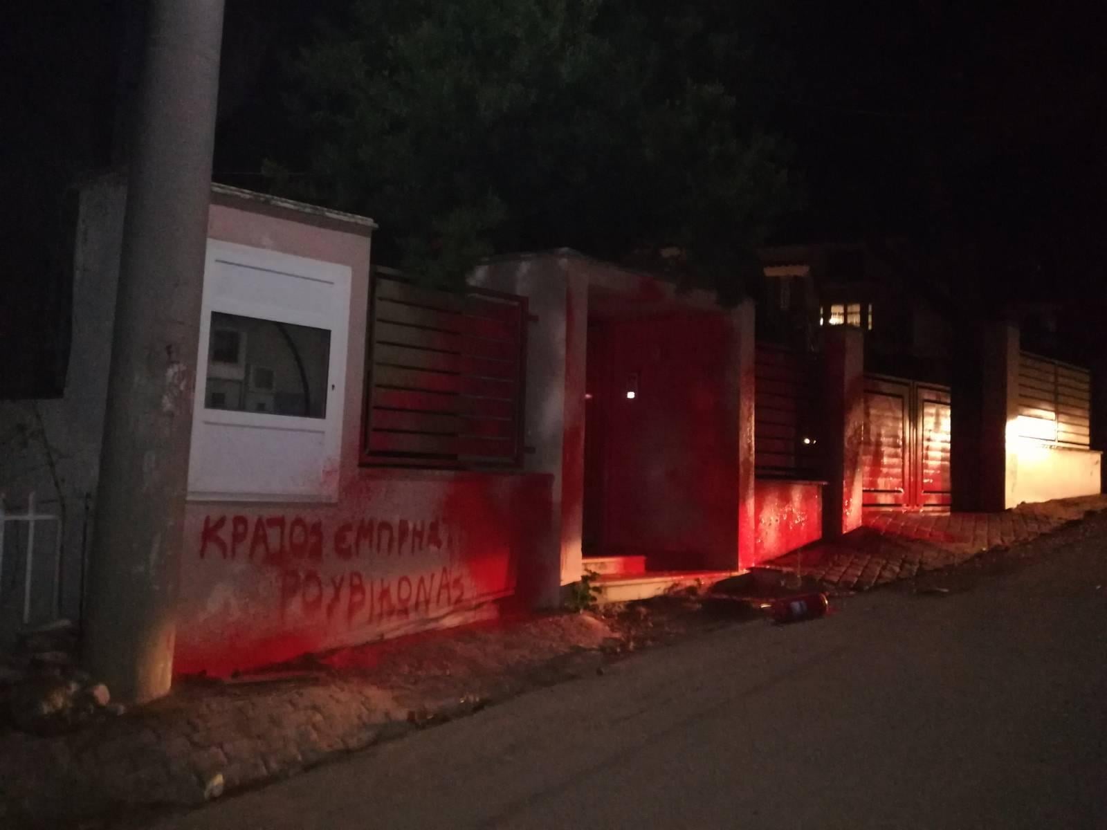 Τα μέλη της συλλογικότητας, έγραψαν «Κράτος Εμπρηστής» με κόκκινη μπογιά στον τοίχο του σπιτιού του υπουργού και στη συνέχεια αποχώρησαν.