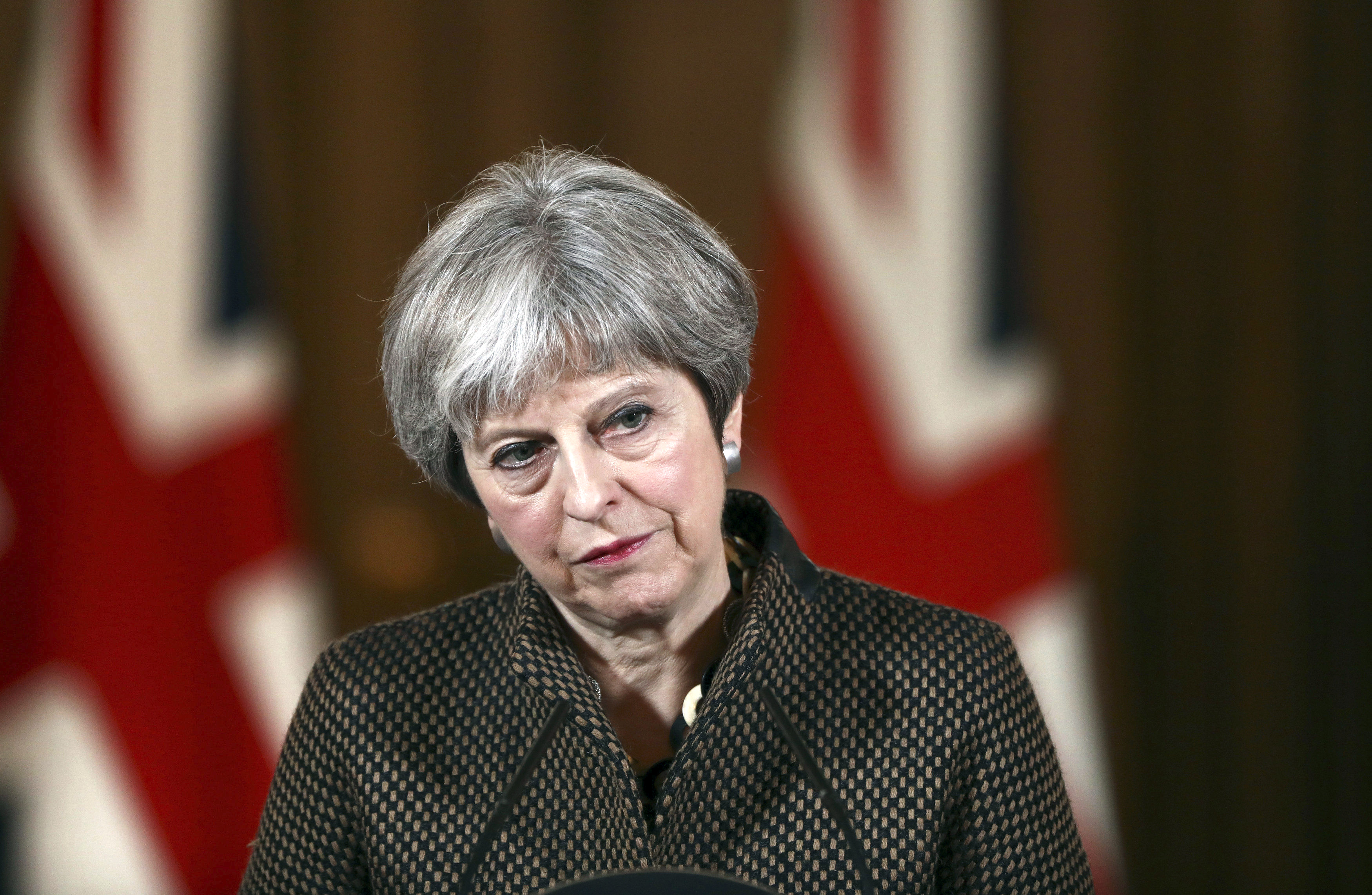 Britain's Prime Minister Theresa May during a press conference in 10 Downing Street, London, Saturday, April 14, 2018. British Prime Minister Theresa May says the need to act quickly and protect “operational security” led her to strike Syria without a prior vote in Parliament. (Simon Dawson/Pool Photo via AP)