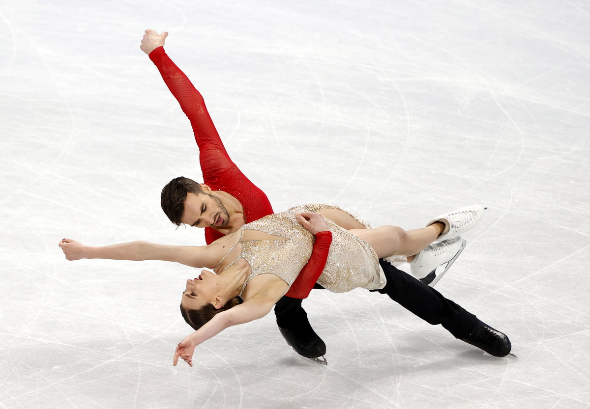 epa09754687 Gabriella Papadakis(front) and Guillaume Cizeron of France perform during the Ice Dance Free Dance of the Figure Skating events at the Beijing 2022 Olympic Games, Beijing, China, 14 February 2022. EPA/HOW HWEE YOUNG