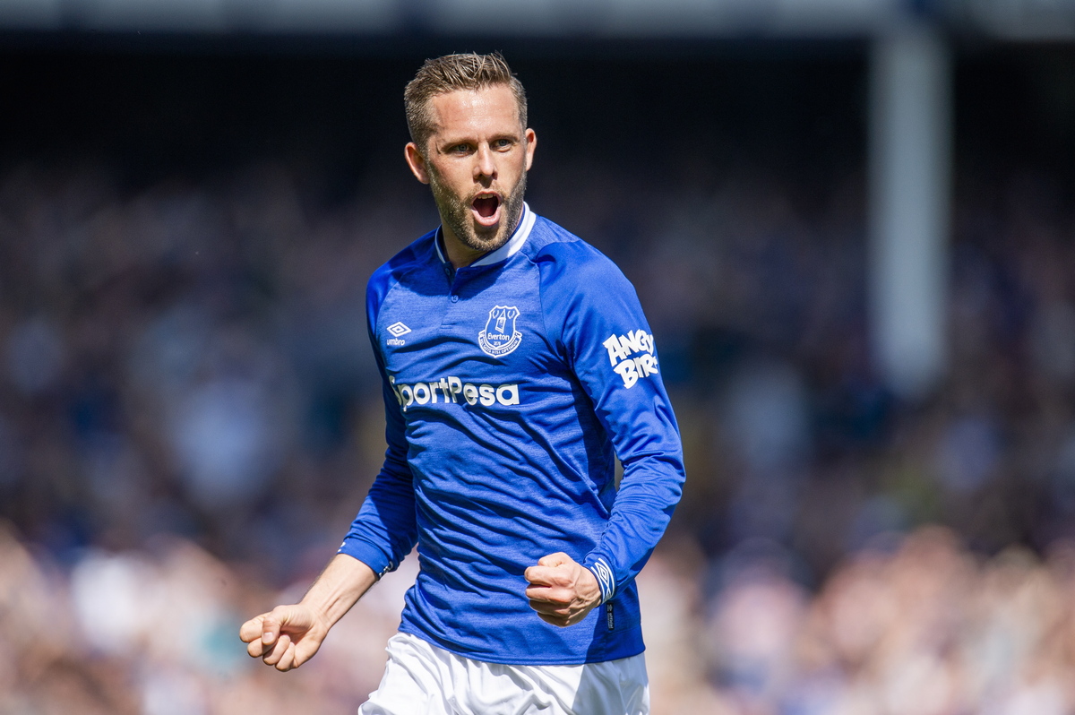 epa07519769 Everton's Gylfi Sigurosson celebrates scoring the second goal during the English Premier League soccer match between Everton and Manchester United held at Goodison Park in Liverpool, Britain, 21 April 2019. EPA/PETER POWELL EDITORIAL USE ONLY. No use with unauthorized audio, video, data, fixture lists, club/league logos or 'live' services. Online in-match use limited to 120 images, no video emulation. No use in betting, games or single club/league/player publications