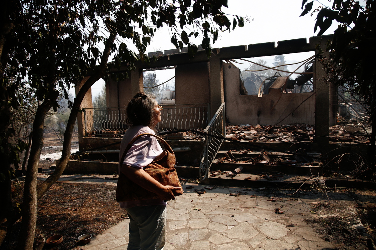 epa09426185 Katerina Digenis, stands in front of her burned house in Kaza area in ??Vilia, Attica, Greece, 23 August 2021. A new fire broke out at noon in Vilia, Attica, this time in the Kaza close to a residential area, according to with the Fire Department. At this time, a precautionary evacuation is taking place, through 112, of the settlements of Vilia and Profitis Ilias. There are now 73 firefighters operating at the site with 25 vehicles, 2 groups of pedestrians, while 6 helicopters and 5 aircrafts are assisting from the air. It is noted that strong winds of up to 8 Beaufort are blowing in the area. EPA/YANNIS KOLESIDIS
