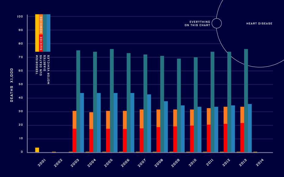 Οι αριθμοί μιλάνε από μόνοι τους. Τα τελευταία 10 χρόνια οι Αμερικανοί που έχουν σκοτωθεί εξαιτίας της άλογης χρήσης όπλων εντός των ΗΠΑ είναι κατά 112 φορές περισσότεροι σε σχέση με όσους έχουν σκοτωθεί από τρομοκράτες. Οι αριθμοί στο infographic του περιοδικού WIRED είναι αμείλικτοι. Συγκεκριμένα, 346,681 έχουν σκοτωθεί από περίστροφα, πυροβόλα και λοιπά όπλα (και όχι μόνο σε τόσο ακραία περιστατικά όπως το πρόσφατο μακελειό στο κολέγιο του Όρεγκον, όπου έχασαν τη ζωή τους 10 άνθρωποι) ενώ 3,050 είναι οι Αμερικανοί πολίτες που σκοτώθηκαν από τρομοκράτες.