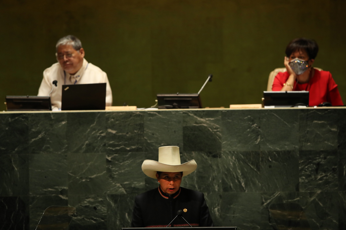 epa09480481 The President of Peru, Pedro Castillo, speaks during the 76th Session of the United Nations General Assembly, at UN headquarters, in New York City, New York, USA, 21 September 2021. EPA/SPENCER PLATT / POOL