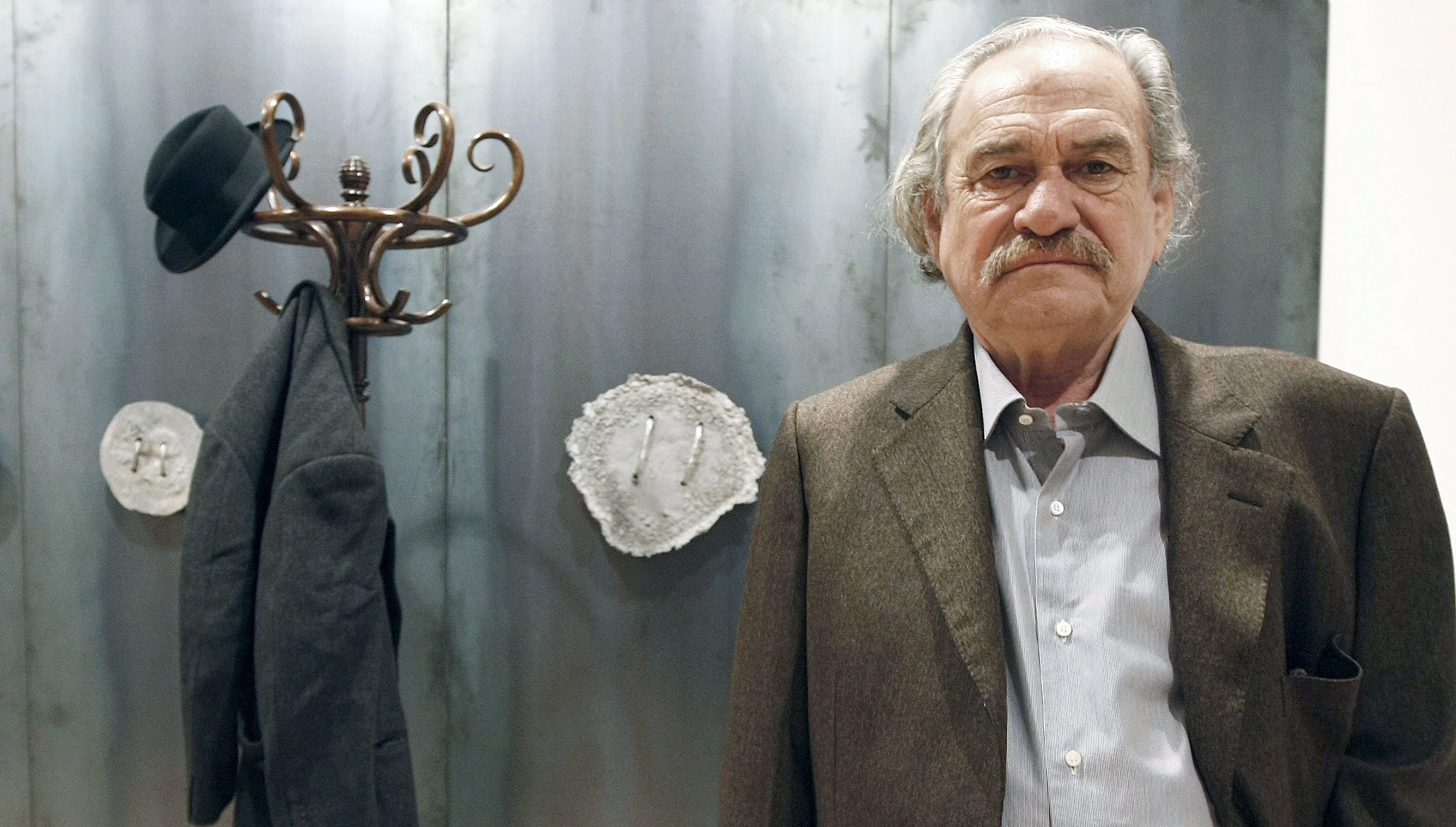 epa01915512 Greek artist Jannis Kounellis poses for photographers next to one of his works at the exhibition that opens its doors to public 30 October 2009 in Santander, Cantabria, Northern Spain. The artist continues reflecting about the tragedy of existence. EPA/ESTEBAN COBO