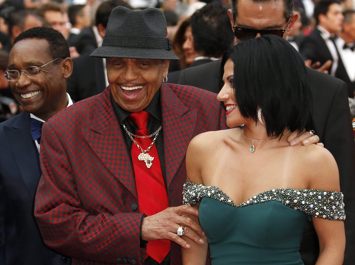 epa04757227 Michael Jackson's father, Joe Jackson (C) arrives with unidentified guests for the screening of 'Sicario' during the 68th annual Cannes Film Festival, in Cannes, France, 19 May 2015. The movie is presented in the Official Competition of the festival which runs from 13 to 24 May. EPA/GUILLAUME HORCAJUELO