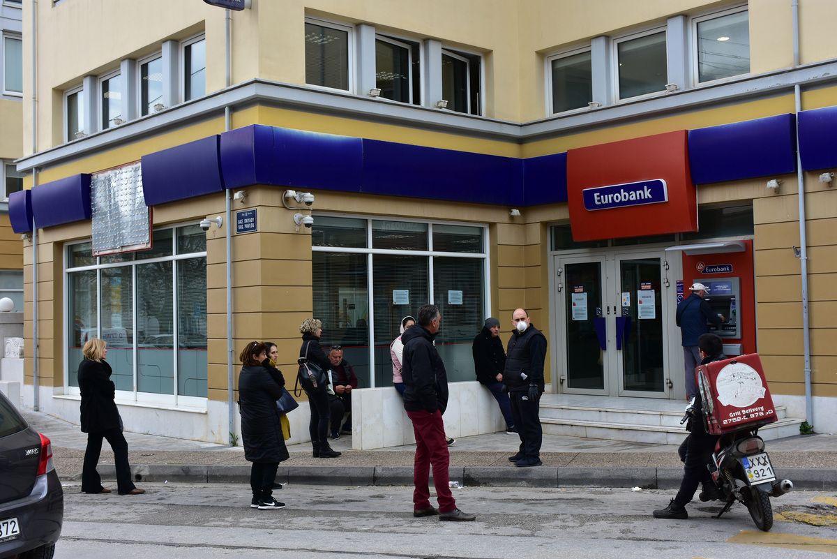 Πολίτες περιμένουν έξω από τράπεζα του Ναυπλίου, μετά από τα νέα μέτρα που έλαβε η κυβέρνηση για τον περιορισμό της εξάπλωσης του κορονοϊού, Δευτέρα 16 Μαρτίου 2020. Έξω από το κατάστημα της Τράπεζας Πειραιώς στο κέντρο του Ναυπλίου έχει σχηματιστεί ουρά με τους πολίτες να περιμένουν υπομονετικά έξω από το υποκατάστημα για να εξυπηρετηθούν. ΑΠΕ-ΜΠΕ /ΑΠΕ-ΜΠΕ/ΜΠΟΥΓΙΩΤΗΣ ΕΥΑΓΓΕΛΟΣ