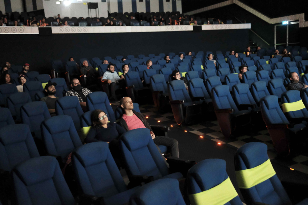 epa08425104 Cinemagoers, some wearing a protective face mask, seat inside a cinema while maintaining social distancing, in San Jose, Costa Rica, 15 May 2020, amid the coronavirus disease (COVID-19) pandemic. EPA/JEFFREY ARGUEDAS