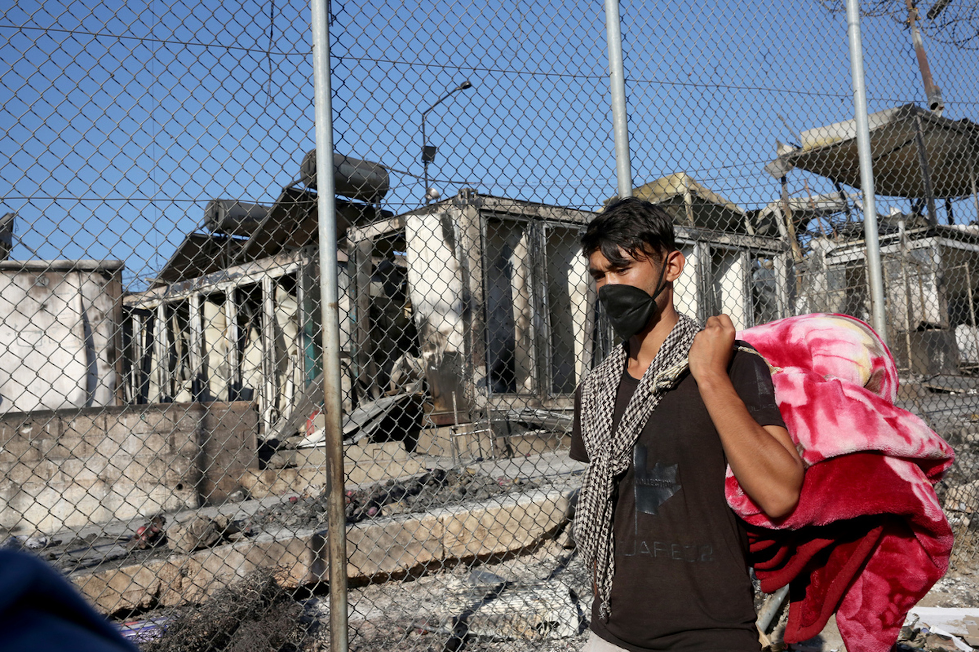 Πρόσφυγες και μετανάστες περπατούν ανάμεσα στα καμένα που άφησε πίσω της η φωτιά στο ΚΥΤ της Μόριας, Πέμπτη 10 Σεπτεμβρίου 2020. Χίλιοι ευάλωτοι αιτούντες άσυλο που διέμεναν στο ΚΥΤ της Μόριας θα φιλοξενηθούν σε πλοίο της Blue Star Ferries που αναμένεται να καταπλεύσει σήμερα στο λιμάνι της Μυτιλήνης και σε δύο αρματαγωγά του πολεμικού ναυτικού που θα μεταβούν αύριο στο νησί, όπως ανακοινώθηκε στη συνέντευξη Τύπου των υπουργών Μετανάστευσης και Εσωτερικών και του προέδρου του ΕΟΔΥ πριν από λίγο στη Λέσβο. Σε κατάσταση έκτακτης ανάγκης για τέσσερις μήνες κηρύχθηκε η Λέσβος με εντολή του υφυπουργού Πολιτικής Προστασίας και Διαχείρισης Κρίσεων Νίκου Χαρδαλιά και απόφαση του Γενικού Γραμματέα Πολιτικής Προστασίας Βασίλη Παπαγεωργίου. Η κατάσταση έκτακτης ανάγκης όπως ανακοινώθηκε από τη ΓΓΠΠ, κηρύχθηκε για λόγους δημόσιας υγείας και αρχίζει από σήμερα. ΑΠΕ-ΜΠΕ/ΑΠΕ-ΜΠΕ/ ΟΡΕΣΤΗΣ ΠΑΝΑΓΙΩΤΟΥ