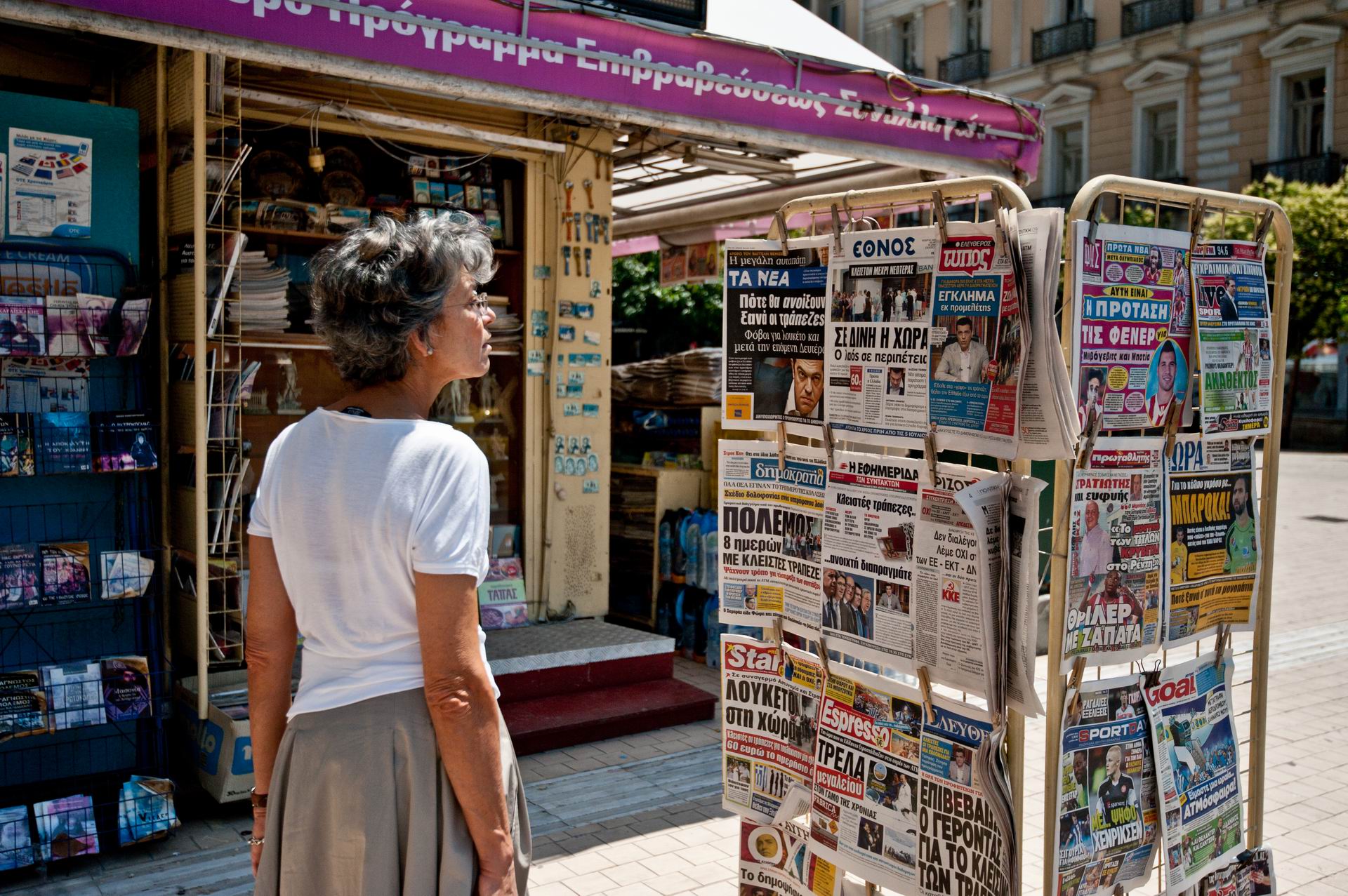 Μια γυναίκα διαβάζει τα πρωτοσέλιδα των εφημερίδων, μετά την ανακοίνωση της ελληνικής κυβέρνησης ότι η τράπεζες της χώρας δεν θα ανοίξουν από τη Δευτέρα και για μια βδομάδα. Αθήνα, Δευτέρα 29 Ιουνίου 2015.