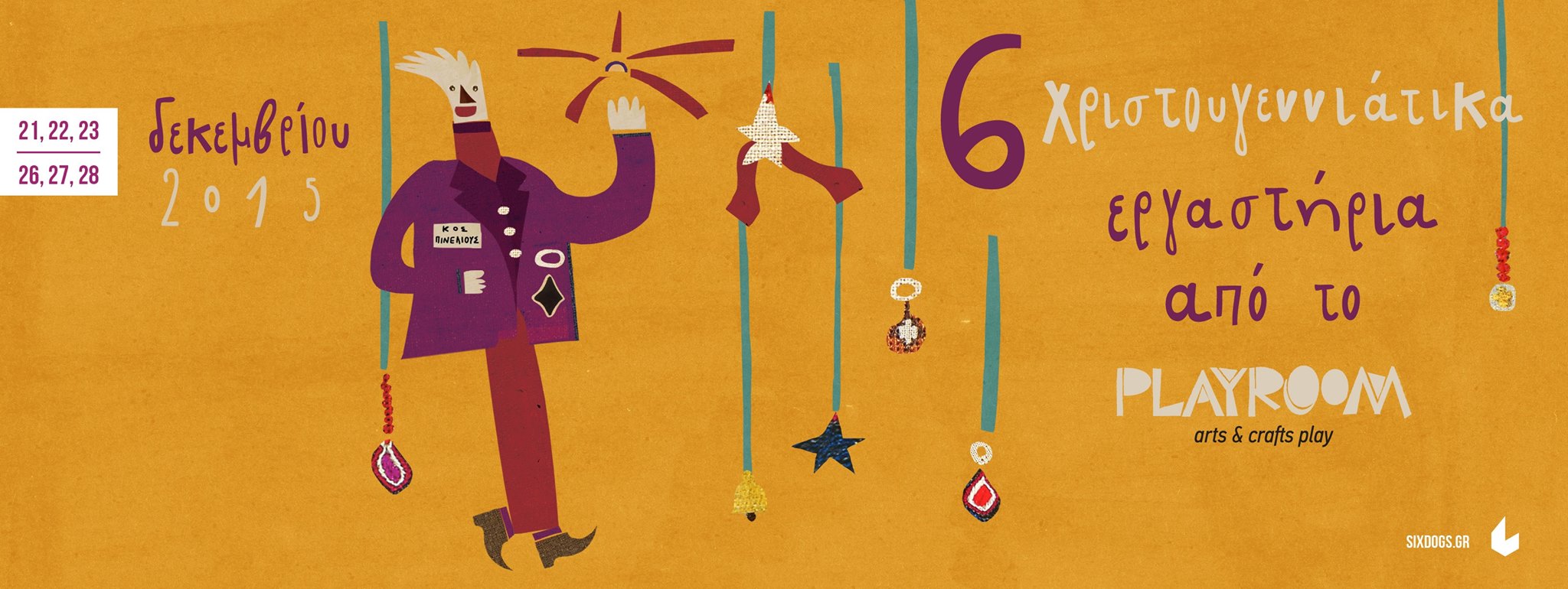 Το Playroom παρουσιάζει μια σειρά 6 πρωτότυπων εργαστηρίων για παιδιά που θέλουν να δώσουν τις δικές τους μαγικές πινελιές δημιουργικότητας και έκφρασης αυτές τις γιορτές. Τα εργαστήρια θα ξεδιπλωθούν στο Project Space του six d.o.g.s και απευθύνονται σε καλλιτέχνες ηλικίας 4-12 ετών.