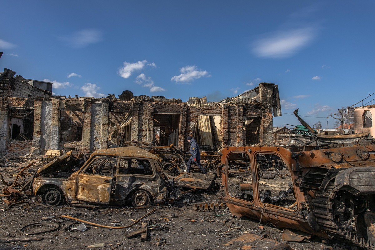 epaselect epa09859955 A Ukrainian rescue worker walks past destroyed Russian military vehicles as he looks for explosive items next to the railway station where the Russian forces were stationed, in the recaptured by the Ukrainian army Trostyanets town, in Sumy region, Ukraine, 29 March 2022 (issued 30 March 2022). Trostyanets was recaptured by the Ukrainian army after the town was under Russian forces from the first days of the war for over a month. Russian troops entered Ukraine on 24 February prompting the country's president to declare martial law and triggering a series of announcements by Western countries to impose severe economic sanctions on Russia. EPA/ROMAN PILIPEY