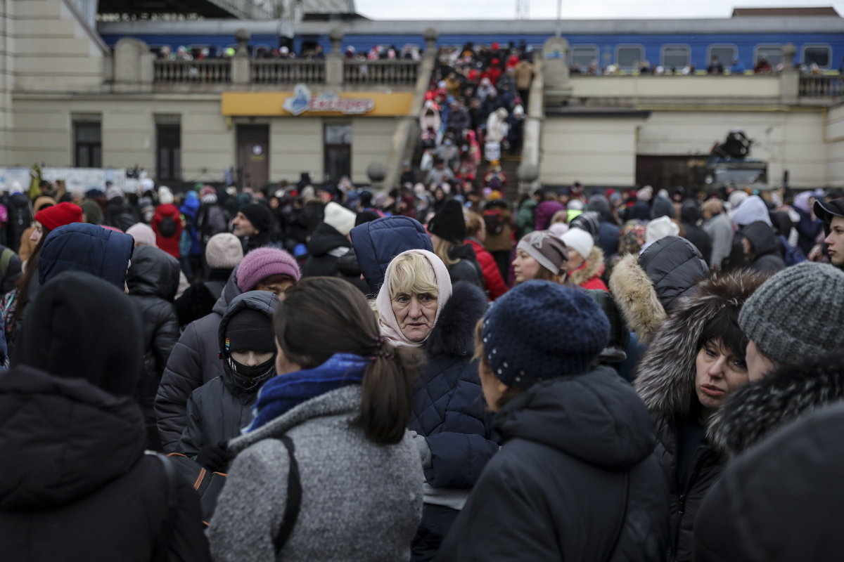 Εκτοπισμένοι Ουκρανοί φτάνουν στο σιδηροδρομικό σταθμό του Λβιβ, για να ξεφύγουν από τη ρωσική στρατιωτική εισβολή στην Ουκρανία, 06 Μαρτίου 2022. EPA/MIGUEL A. LOPES