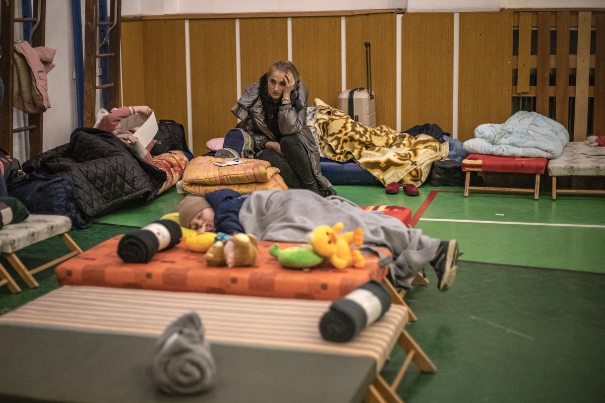 epa09785343 People fleeing Ukraine rest inside the sports hall of a local elementary school after entering Slovakia through the Ubla border crossing, in Ubla, Slovakia, 25 February 2022. Slovakia said it will let fleeing Ukrainians into the country following Russia's military operation in Ukraine. The Slovak Police Force announced on social media that people not holding a valid travel document will also be eligible for entry on an individual basis. EPA/MARTIN DIVISEK