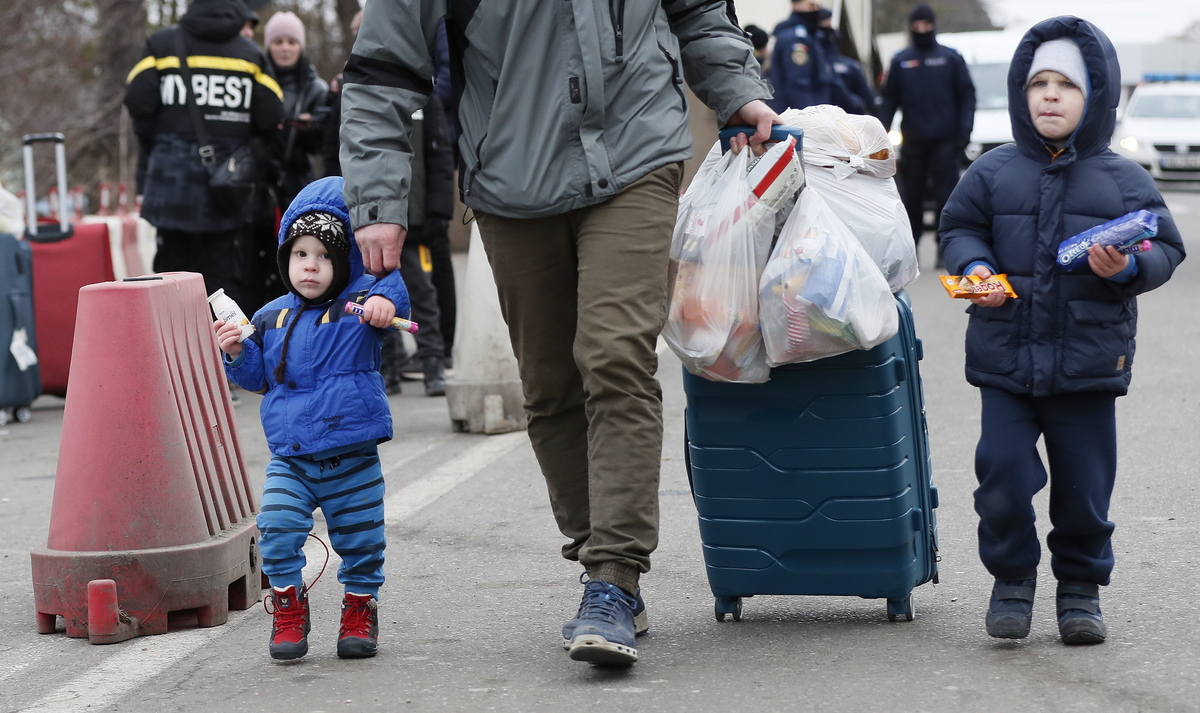 epa09786150 A Ukrainian family passes trough the Romanian-Ukrainian border crossing point in Siret, Romania, 26 February 2022. Romanian authorities decided to make an exception regarding Covid-19 quarantine for all refugees entering Romania from Ukraine. Russian troops entered Ukraine on 24 February prompting the country's president to declare martial law and triggering a series of announcements by Western countries to impose severe economic sanctions on Russia. EPA/ROBERT GHEMENT