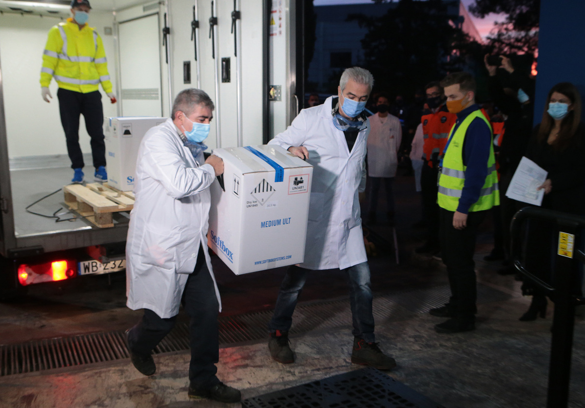 Άνδρες του υπουργείου Υγείας παραλαμβάνουν για αποθήκευση τις πρώτες δόσεις του εμβολίου για τον κορονοϊό το οποίο έφτασε σήμερα στην Αθήνα με φορτηγό- ψυγείο μέσω Προμαχώνα Σάββατο 26 Δεκεμβρίου 2020. Ο υφυπουργός Πολιτικής Προστασίας και Διαχείρισης Κρίσεων, Νίκος Χαρδαλιάς, ανέλαβε την επιτήρηση της επιχείρησης με την κωδική ονομασία «Ιπποκράτης», την επιχείρηση – δηλαδή – για την διαφύλαξη της ασφάλειας των εμβολίων.Στο σημείο βρίσκονταν και συνόδευαν το φορτηγό με τις πρώτες 9.000 δόσεις, ισχυρές αστυνομικές δυνάμεις. Και η έλευση στην Αθήνα έγινε υπό την επίβλεψη του κ. Χαρδαλιά . ΑΠΕ-ΜΠΕ/ΑΠΕ-ΜΠΕ/Παντελής Σαίτας
