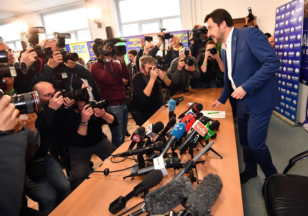 epa06582091 Matteo Salvini (R), the Federal Secretary of the Italian right-wing party 'Lega' (League), poses for the media during a news conference at the party's headquarter in Milan, Italy, 05 March 2018. The party that ran for the genaral elections in a coalition with the 'Forza Italia' (FI) party of former Prime Minister Silvio Berlusconi, gained more votes within the alliance than the FI and sees Salvini now as the contender for the alliance's leadership. General elections were held in Italy on 04 March 2018 with the country's economic struggle and reaction on the massive migrant influx reflecting the voters' decisions. EPA/DANIEL DAL ZENNARO
