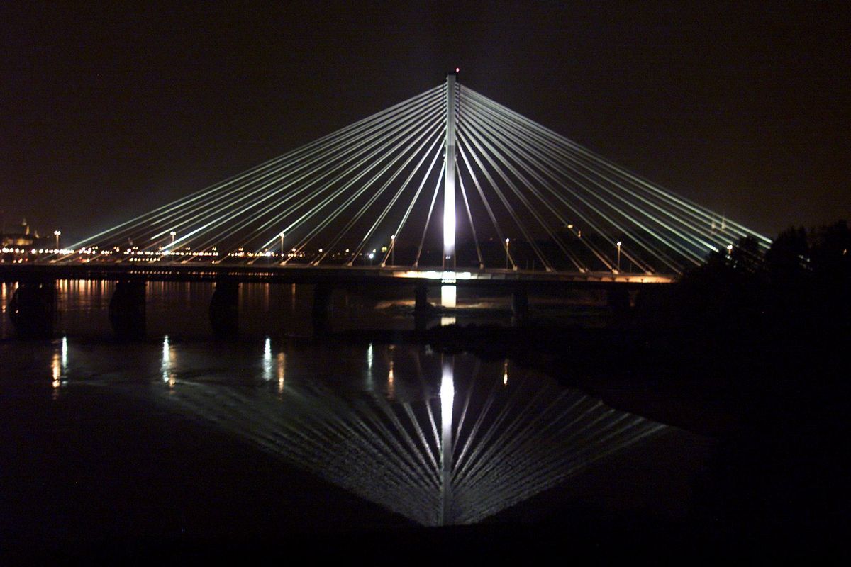 WAR05-20001004-WARSAW,POLAND: Night view from Tuesday 3rd October 2000 of Swietokrzyski bridge, Poland's first pylon suspension bridge in Warsaw which will be officially opened tomorrow (Thursday 5th Oct.,), The city's widest bridge with a width of 31m, a length of 477m and a pylon height of 87.5 m above the average level of the Vistula river, was designed by Finnish architect Pekka Pulkinnen. EPA PHOTO JANEK SKARZYNSKI